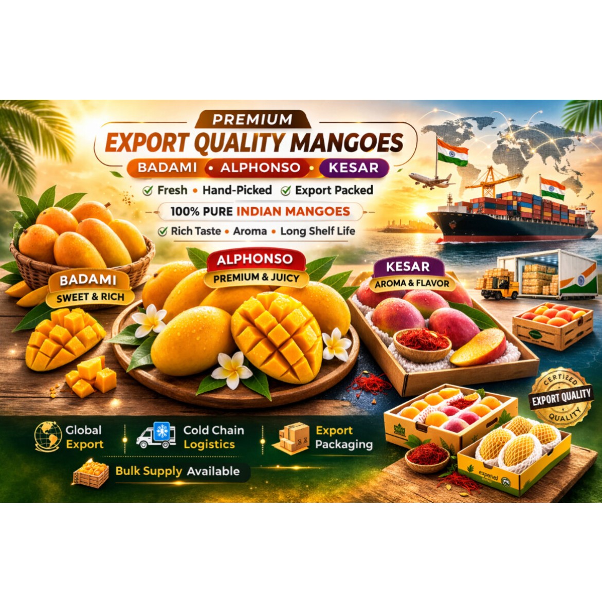 India’s Export Quality Mango season is active with premium varieties like Badami Mango, Alphonso Mango, and Kesar Mango in high global demand. These Premium Indian Mangoes are hand-picked, graded, and export-packed to meet strict International Export Standards, ensuring rich taste, aroma, and long shelf life.