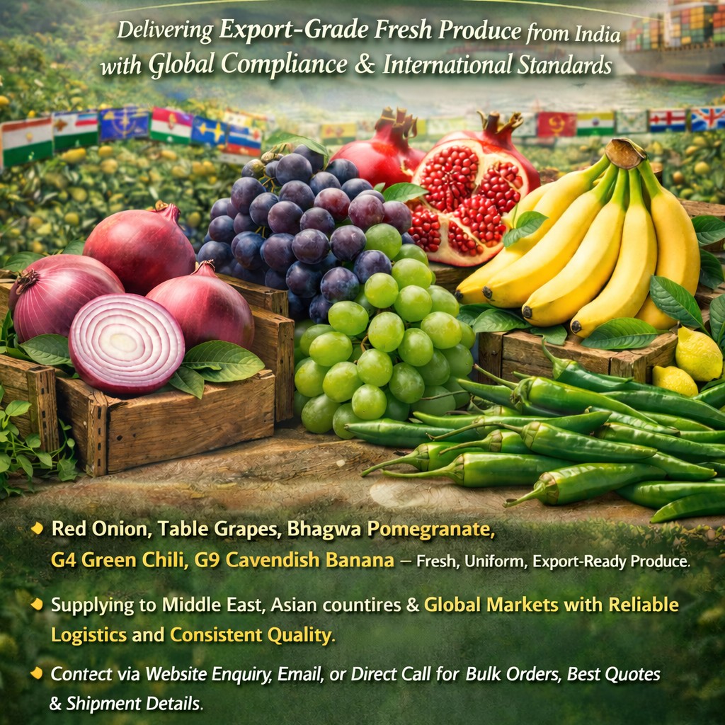 Delivering Export-Grade Fresh Produce from India with Global Compliance &International Standards. All products are graded, sorted, and export-packed to ensure Premium Quality and Safe Long-Distance Shipment.