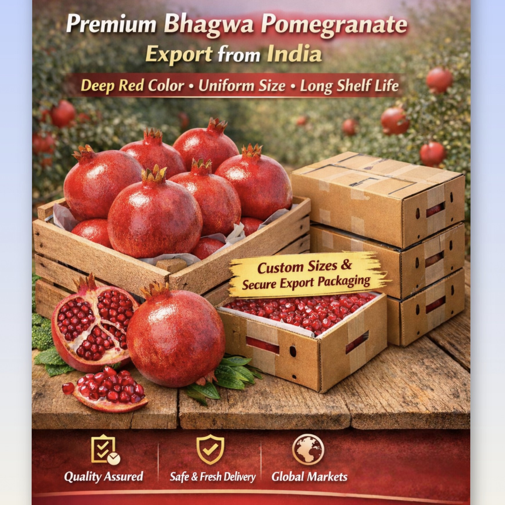 Available in custom sizes (count & weight) and securely packed in strong corrugated boxes with protective liners to ensure export safety, freshness, and damage-free delivery. Supplying farm-fresh Indian pomegranates to the Middle East, Gulf Countries, and Asian markets.