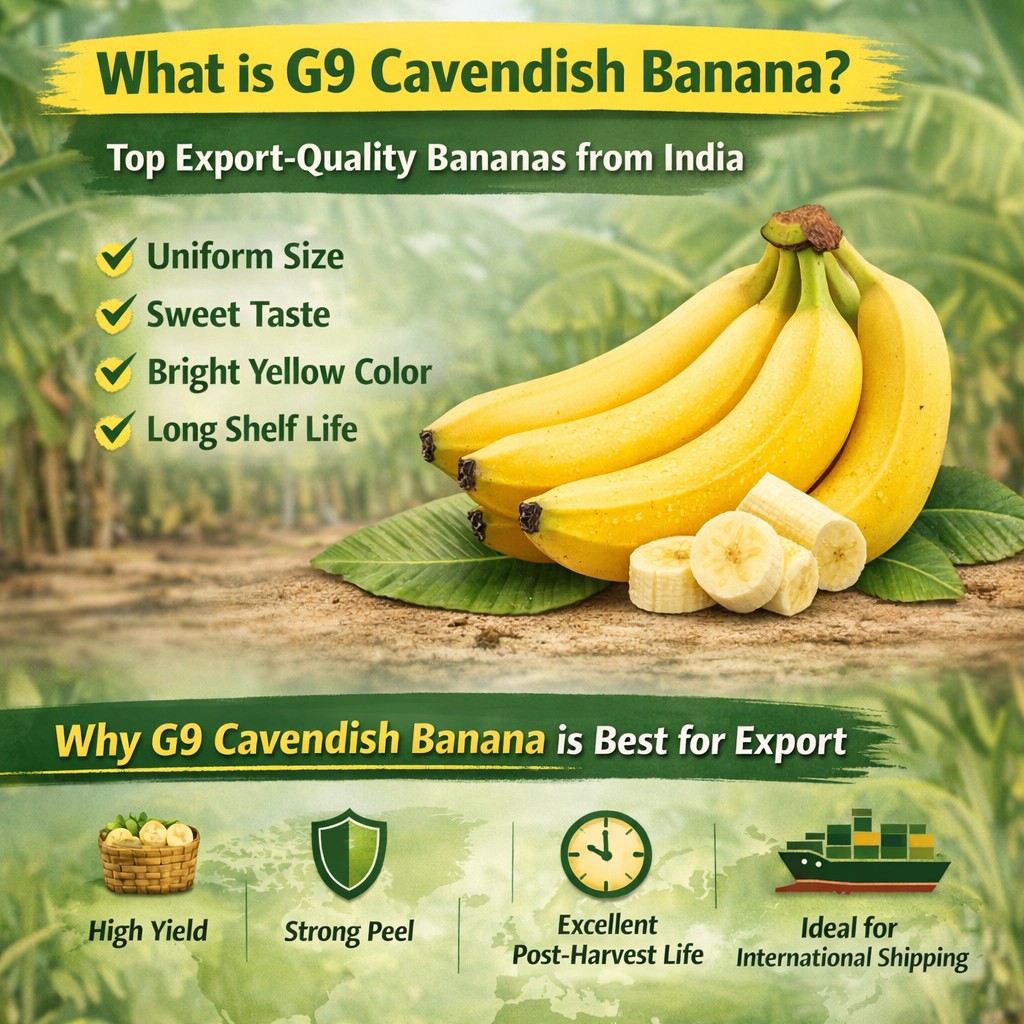 G9 Cavendish Banana is one of the most popular Export-quality banana varieties from India, known for its uniform size, sweet taste, bright yellow color, and long shelf life.